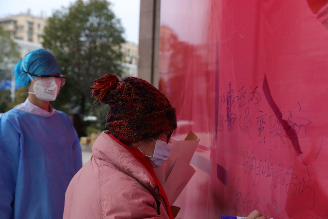 住院期间,医护人员尽心尽责的治疗与无微不至的照护让72岁的陈婆婆看在眼里,疼在心里。陈婆婆的病情逐渐稳定并好转,经两次核酸检测确认为阴性,复查胸部CT较之前也有了明显吸收。出院当天,陈婆婆激动不已,再次高歌一曲此前在病房改编的歌曲《医患情缘》:“唱不完的是感激,说不完的是谢谢!只把那白衣战士对病人的爱,余生中永远记心怀......”随后,陈婆婆在一面题为“欢送新冠肺炎患者治愈出院”的背景墙上写下“医护人员蛮扎实,谢谢你们,伢们加油!”