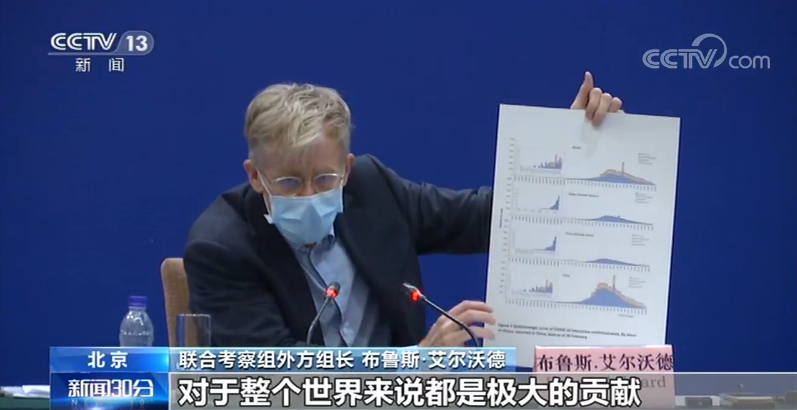 联合考察组外方组长 布鲁斯·艾尔沃德:一般的数据模型和一般的情况往往是它会继续急剧攀升之后,走上一个缓慢下降的道路,直到无易感人群传播停止为止。而在这里,在中国我们看到的情况是,它出现了一个高峰和平台期的状态之后就出现了下降。我们知道在流行病学方面,如果出现了这样的曲线,必然是由于干预措施,流行病学曲线可能的样子和这个流行病学曲线实际的样子,中间的差距就展示了由于中国采取了有力措施,是如何避免了数十万人的感染。而这样的成绩是来之不易的,因为对应的这些流行病学的曲线,其背后在每一条线上都是一个了不起的政策决定,都是中国的领导人了不起的决定,做决策很难,公众能够去按照这样的决策去操作也是不易的,正是这些才带来了这样的曲线(变化)。