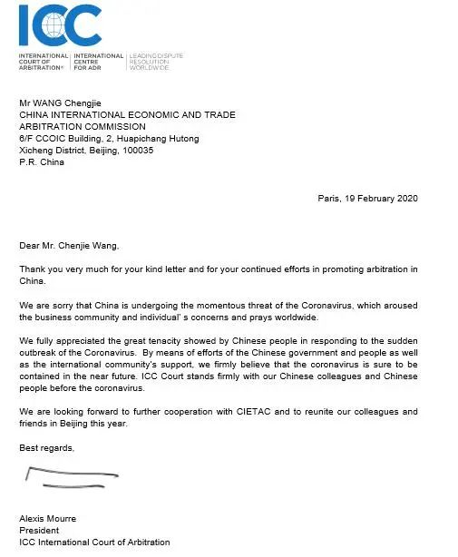 中国正处在经历抗击新冠肺炎的艰难时期,世界其他国家也一样。你们不是孤军战斗,我们始终与你们站在一起。我们非常确信仲裁机构之间的紧密联系依旧,并珍惜两家机构之间的合作关系。