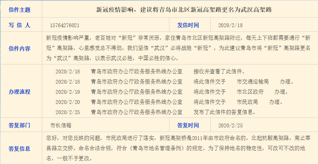 2月25日,青岛市政府办公厅政务服务热线办公室发布了对此信件的答复信息:新冠高架桥是2011年由市政府命名,命名合法合规,为了保持地名的稳定性,可改可不改的地名,一般不予更改。