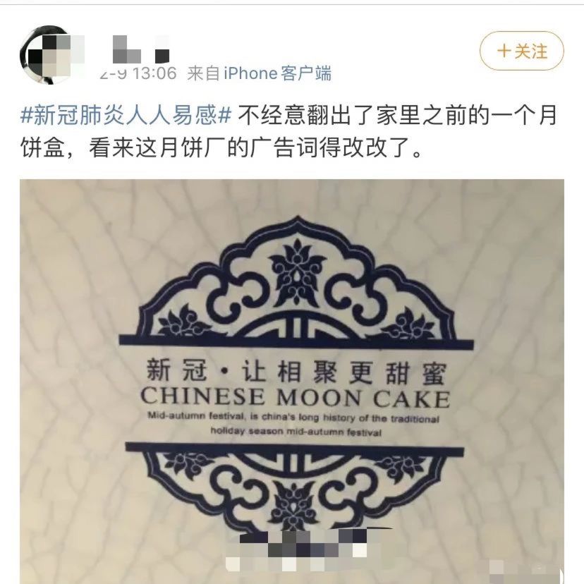 红星新闻记者在网上看到,有网友翻出自己家中的“新冠”月饼礼盒,发文说:“这个著名商标的牌子怕是砸了”。记者注意到,该月饼礼盒正中间就写着“新冠”二字。还有网友发文表示“看来这月饼厂的广告词该改改了”,并配上写着“新冠让相聚更甜蜜”广告语的礼盒。