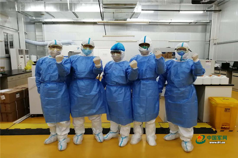 刚刚转改文职人员的刘威副研究员、杨超杰博士,不顾孩子年幼、妻子怀孕,主动申请前出武汉协助火神山医院建立检测平台,每天全“服”武装埋头实验室,一干就是一个多月。“我们作为疾控战线的国家队、八一队,就是要坚决贯彻习主席指示要求,干最危险的事,做最艰苦的工作,‘让党旗在防控疫情斗争第一线高高飘扬’”,这是中心领导经常说的话。