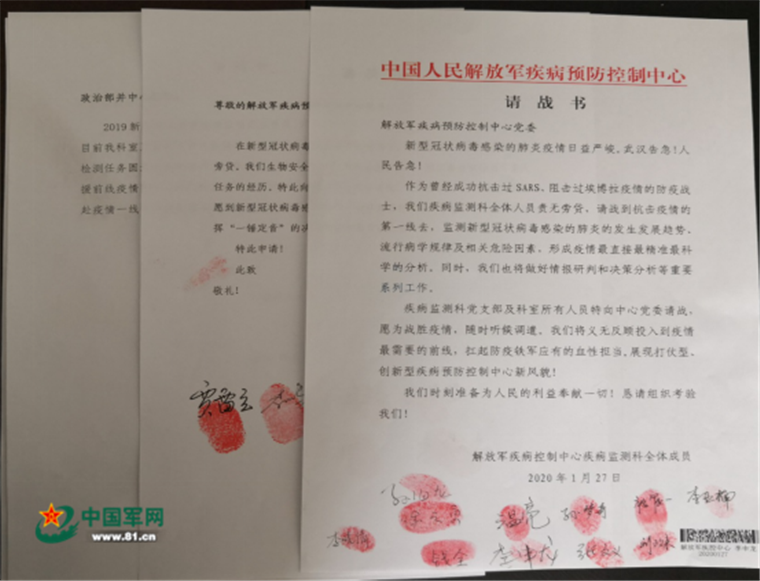 一份份斗志昂扬的请战书,一个个鲜艳夺目的红手印,一颗颗无私无畏的赤子心,如一团团吞噬“疫魔”的烈火,凝聚在党旗军旗下,展现着军队疾控人信念如铁、临危不惧的赤胆忠心。
