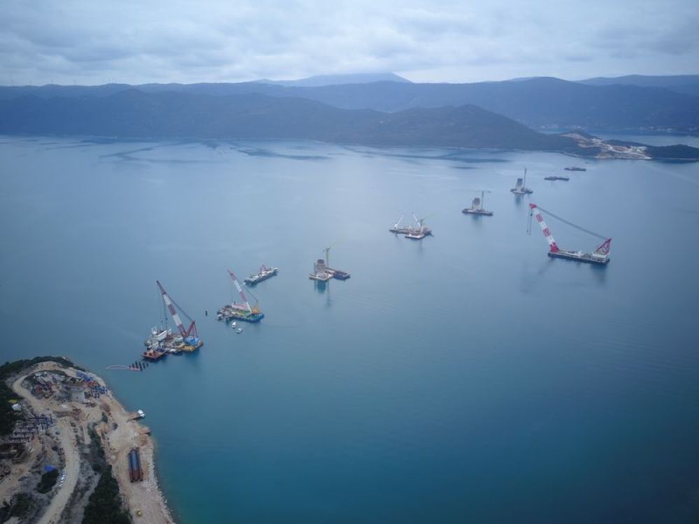 图为2月1日在克罗地亚南部的科马尔纳航拍的佩列沙茨大桥施工现场。佩列沙茨跨海大桥项目由中国路桥公司牵头的中国企业联合体于2018年中标该项目后开工,大桥设计总长2440米,建成后将横跨亚得里亚海小斯通湾,连接隔海相望的克罗地亚领土。目前该项目进展顺利,已全面进入水上施工阶段。(新华社记者高磊摄)
