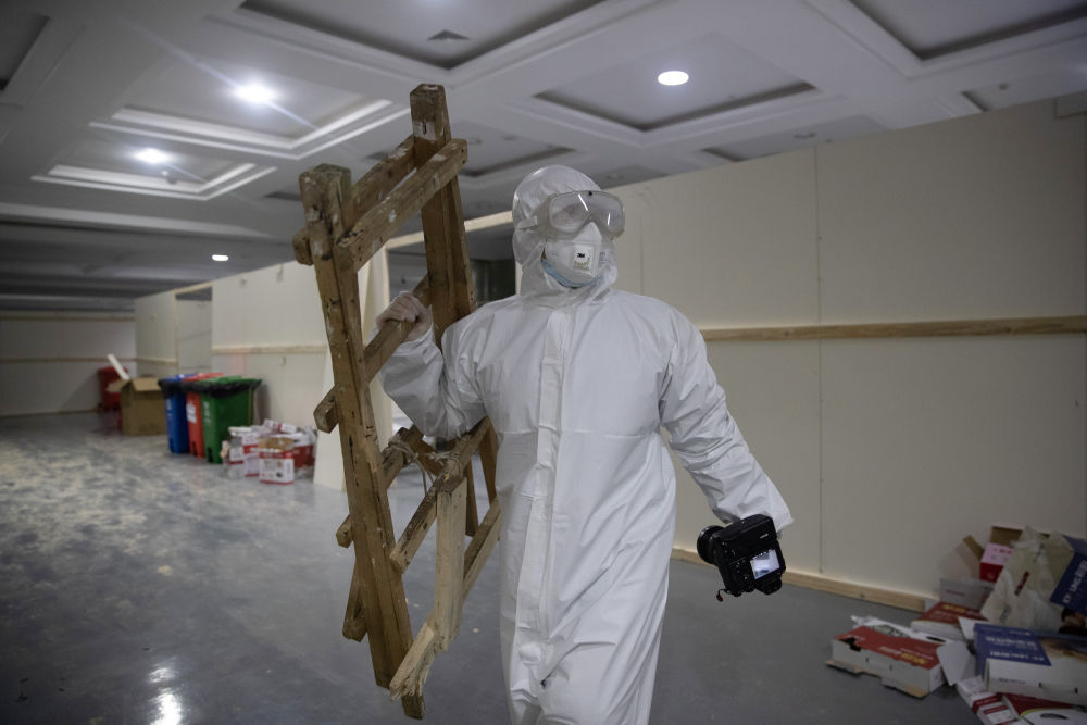 2月5日,新华社记者熊琦在江汉方舱医院内采访。新华社发