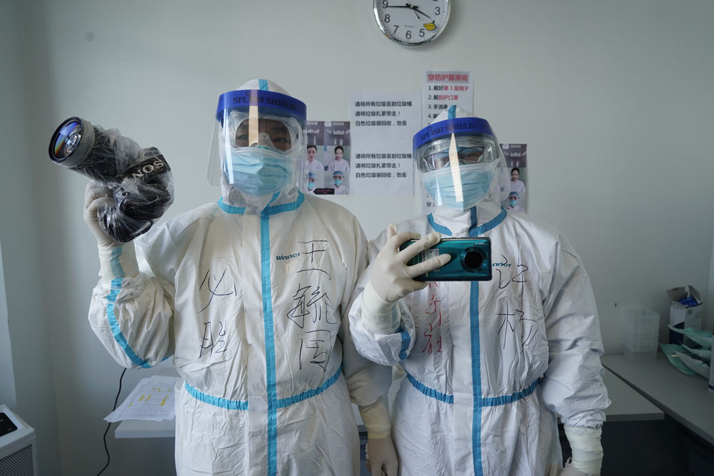 2月18日,新华社记者王毓国(左)和许杨在武汉同济医院中法院区重症隔离病区采访。新华社发