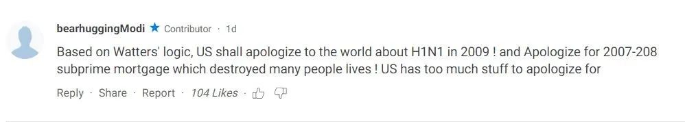 网友“BearhuggingModi”评价说:“根据瓦特斯的逻辑,美国应该为2009年的H1N1流感道歉!为2007-2008年毁掉很多人生活的次贷危机道歉!美国需要道歉的事情可太多了。”