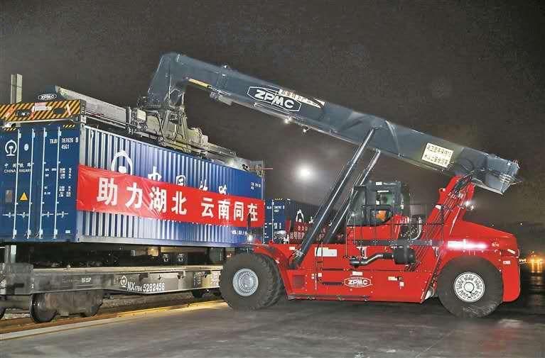 ↑2月18日,云南组织开通火车专列运输捐赠的农产品驰援湖北 。(资料图片)