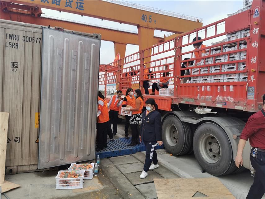↑图为广西志愿者正在给果蔬专列装车。(资料图片)