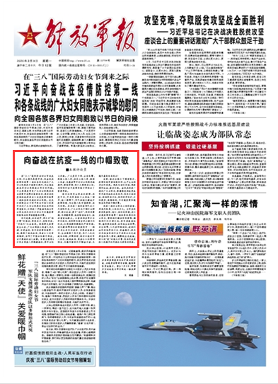 在“三八”国际劳动妇女节到来之际,习主席代表党中央,向奋战在疫情防控第一线和各条战线的广大妇女同胞表示诚挚的慰问,向全国各族各界妇女同胞致以节日的问候。习主席高度肯定广大妇女同胞在抗击疫情中发挥的重要作用,要求各级党委和政府要关心关爱疫情防控第一线和各条战线的妇女同胞。这充分体现出以习近平同志为核心的党中央对广大妇女同胞的亲切关怀和厚望重托,必将进一步激励包括全军女同志在内的亿万妇女为打赢疫情防控阻击战贡献智慧和力量。