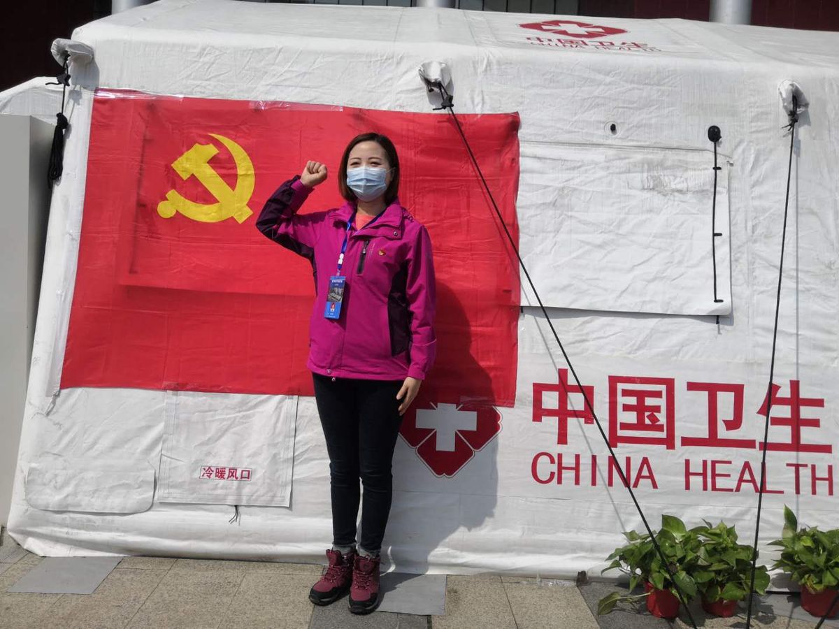 3月7日,在武汉客厅方舱医院外,郭玉蓉和其他39名新疆援助医疗队员面对鲜红的党旗庄严宣誓,光荣加入中国共产党,成为一名中共预备党员。 图为宣誓后郭玉蓉和党旗合影留念。