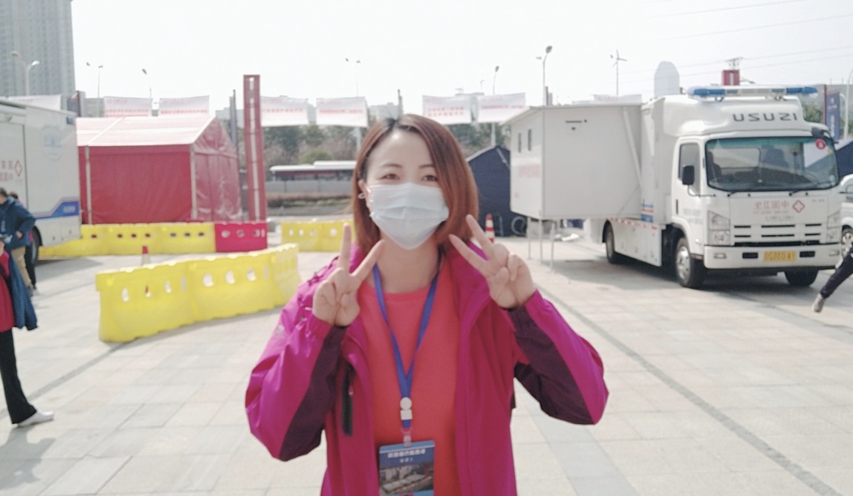 3月8日,武汉客厅方舱医院患者全部治愈出舱,客厅方舱医院休舱。郭玉蓉在客厅方舱医院外留影,纪念自己和新疆第二批援鄂医疗队员共同战斗了一个月的战场。