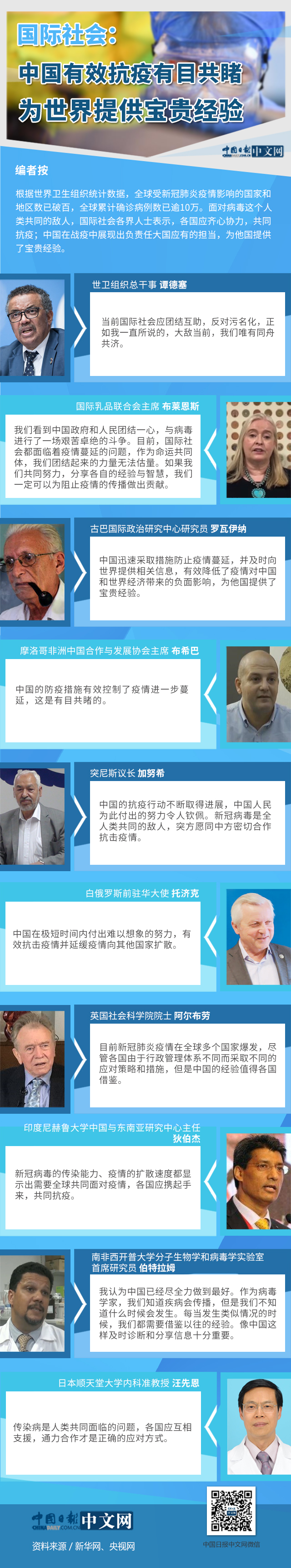 根据世界卫生组织统计数据,全球受新冠肺炎疫情影响的国家和地区数已破百,全球累计确诊病例数已逾10万。面对病毒这个人类共同的敌人,国际社会各界人士表示,各国应齐心协力,共同抗疫;中国在战疫中展现出负责任大国应有的担当,为他国提供了宝贵经验。