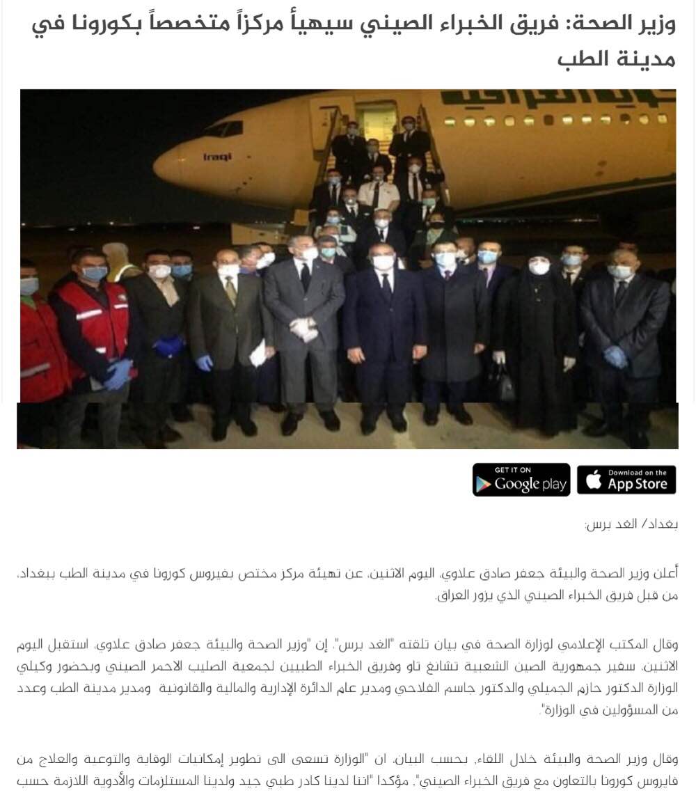 伊拉克当地媒体报道,伊卫生和环境部长贾法尔3月9日表示,中国医疗专家小组将在巴格达建立一个新型冠状病毒专业研究中心。
