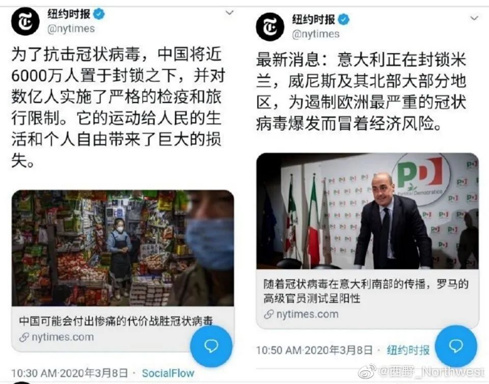近日,《纽约时报》连续发布推文,点评中国封城“给人民的生活和自由带来了巨大损失”,意大利封城则是“为遏制冠状病毒肺炎,冒着经济风险”。两条信息发布时间仅仅相隔20分钟,却充分展示了这家标榜“客观公正”的媒体是如何“双标”的。