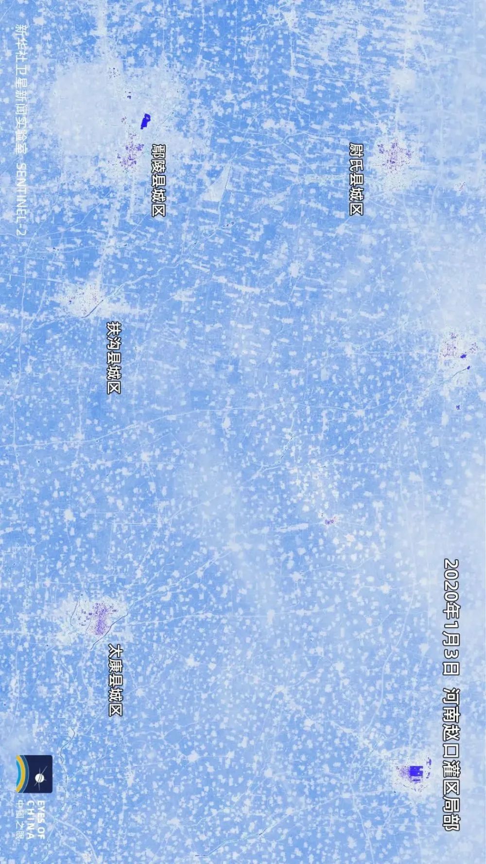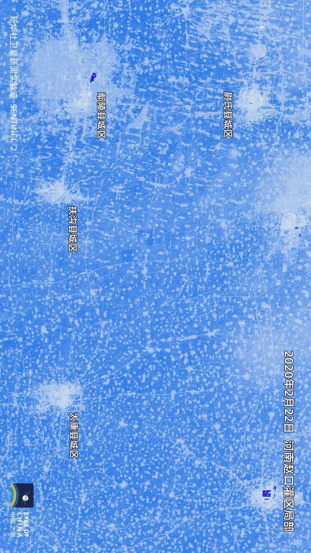卫星遥感技术不仅可观测土壤含水量,也能有效发现植物含水量的变化。遍布冬小麦农田的赵口灌区,春灌开始后地面植物含水量明显提升,显示为更浓郁的蓝色。
