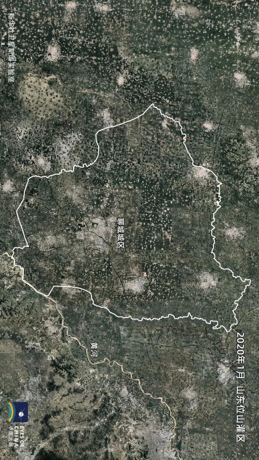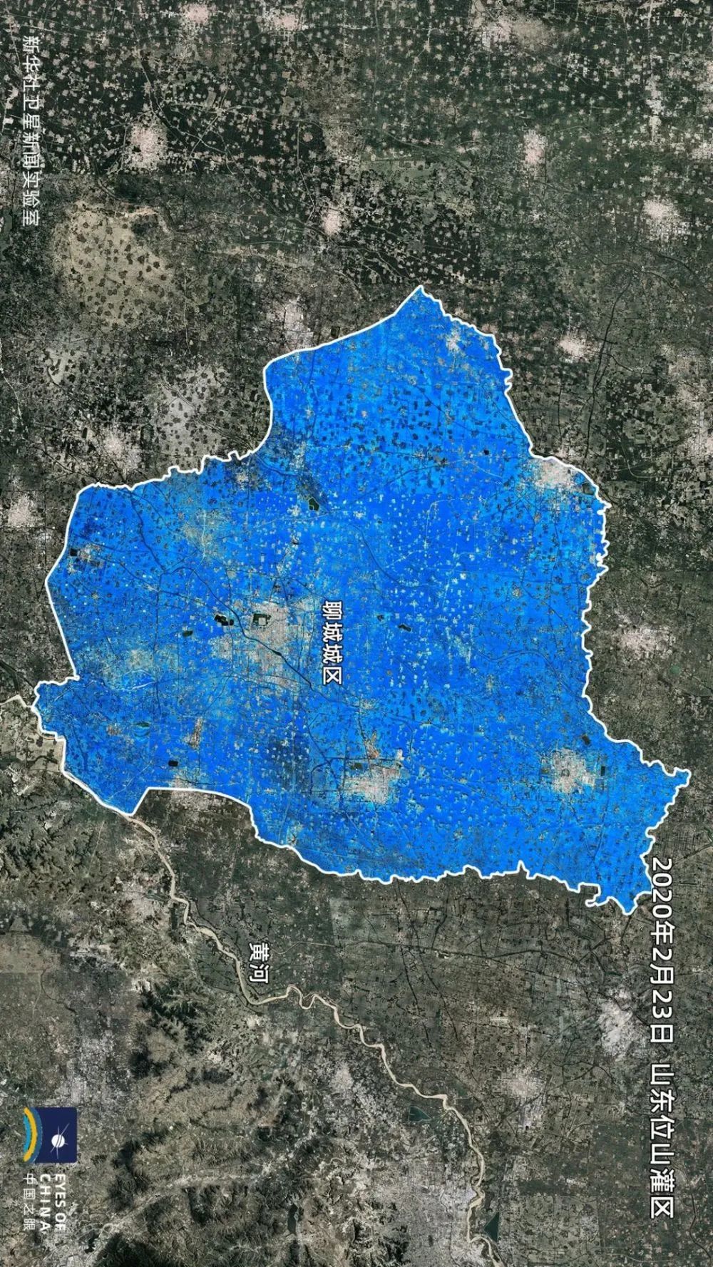 高分辨率卫星影像中的位山灌区,水渠、农田、村庄、小镇以及连片的光伏板,构成了鲁西大平原上的现代农业产区景观。