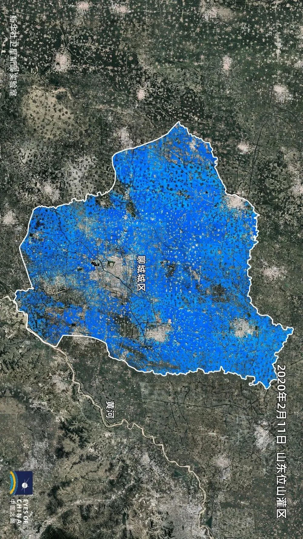 上面这三张图,是卫星遥感在不同时间观测到的土壤湿度情况:2月11日位山灌区大部分土地已灌溉,2月23日则几乎全部灌溉。