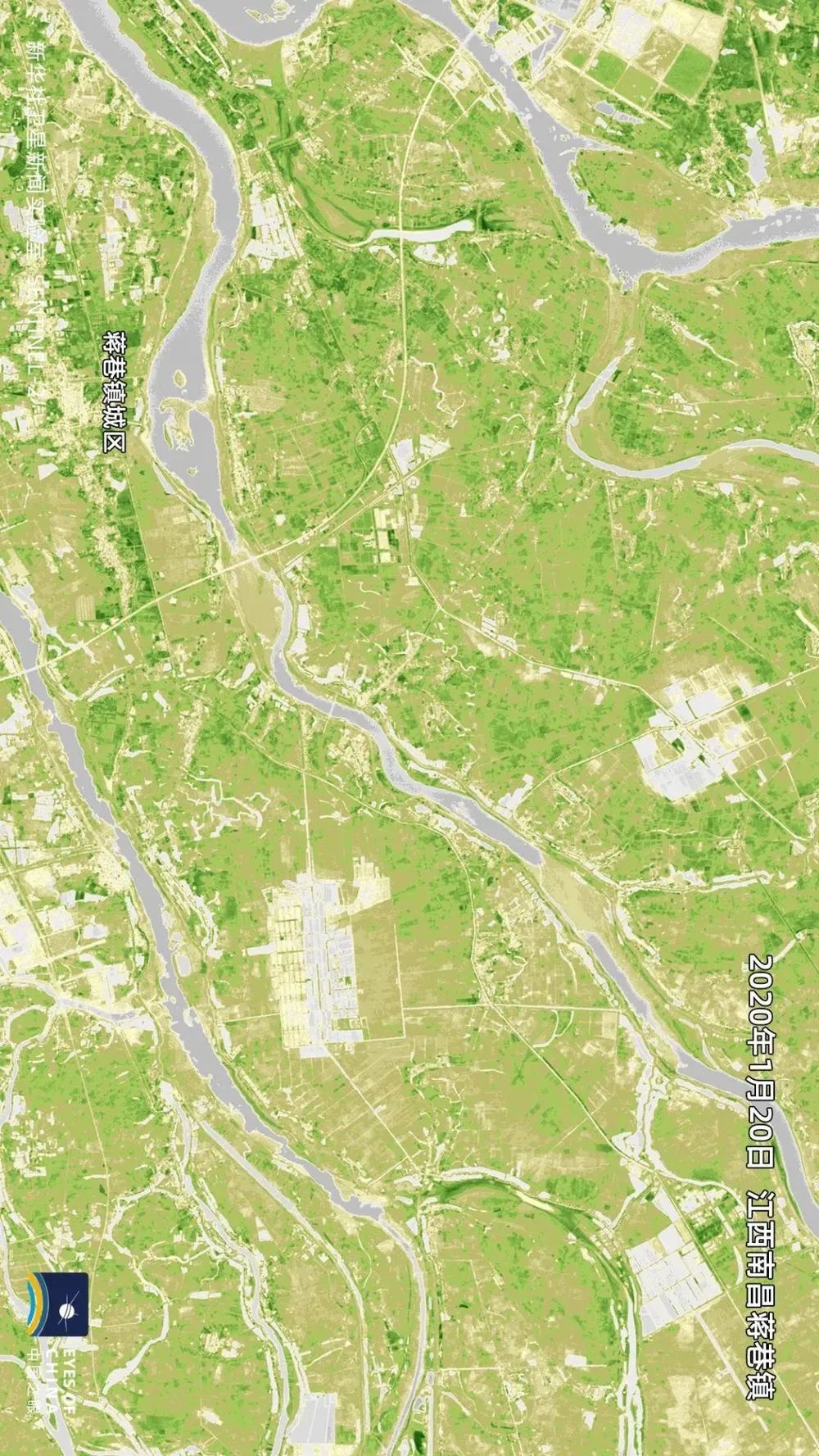 蒋巷镇所在的鄱阳湖平原,稻田、菜畦、鱼塘、莲湖纵横交错,是江南的粮仓,也是棉花、油料、生猪等的重要生产基地。从上面两张相距一个半月的卫星图对比可见,这一区域既有叶绿素水平提升、绿色渐浓的夏收作物地块,也有春播农田——它们在卫星遥感观测中,因翻地、放水泡田而显示为更加明显的灰色。