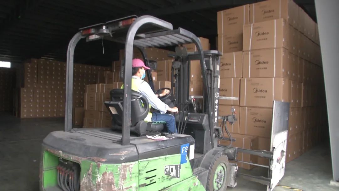 在海南金畅现代物流中心一期项目施工现场,工人们正在忙碌作业,库房前叉车来来往往,紧锣密鼓地装卸货物,预计六月底完成项目整体建设。