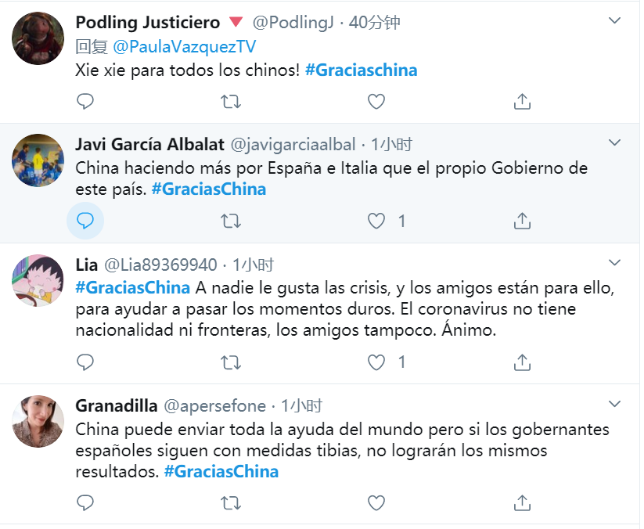 颇有意味的是,由于美国总统特朗普在一天前宣布对欧洲的旅行禁令,让一贯是美国盟友的欧洲感到极为不满,许多西班牙网友在看到中国的帮助后情不自禁地对两国做了一番比较。有人联系起近期西方一些对华种族主义言论写道,“特朗普对我们像对害虫一样,而中国却给了我们帮助。你们还要继续那些操蛋的种族主义言论么?”