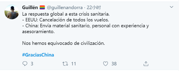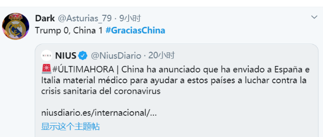 而由于此事正值美国总统特朗普因新冠疫情宣布对欧洲实施旅行禁令,不少西班牙网友就把中美两国进行了一番比较,感叹“美国把我们视为害虫,中国却在帮助我们”