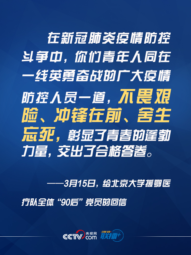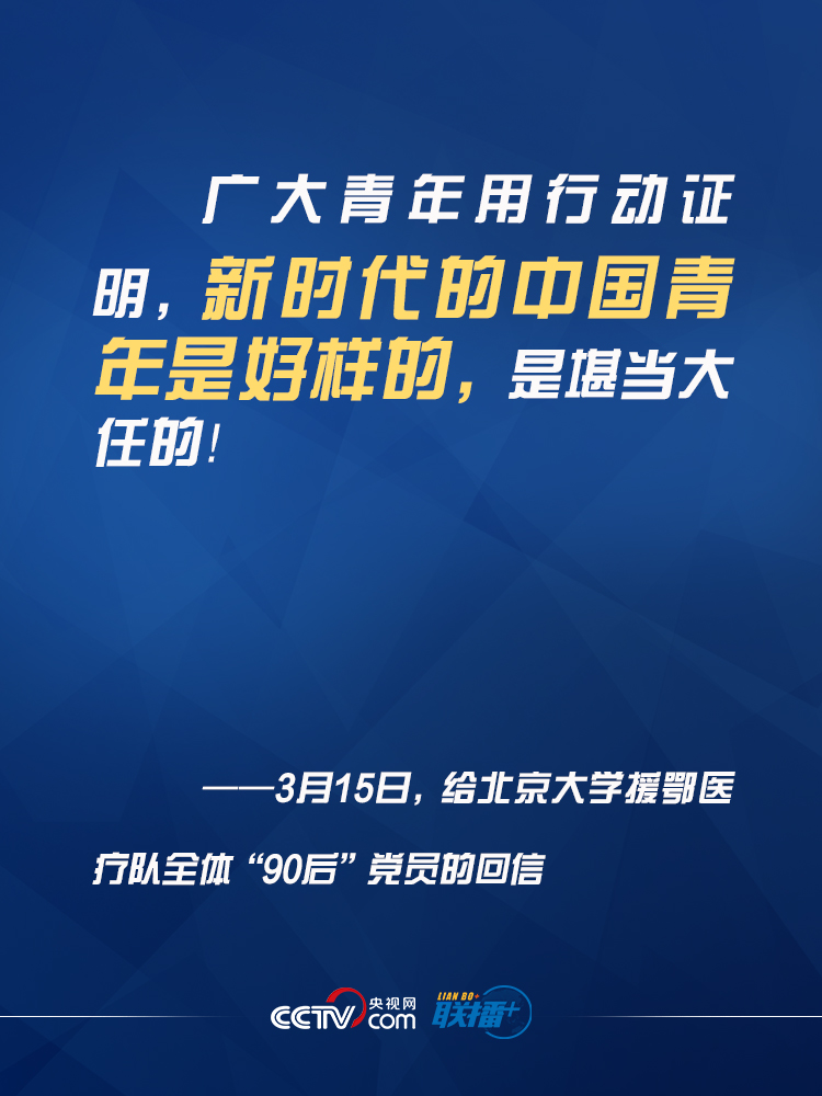 “广大青年用行动证明,新时代的中国青年是好样的,是堪当大任的!”在3月15日给北京大学援鄂医疗队全体“90后”党员的回信中,习近平这样点赞新时代中国青年。