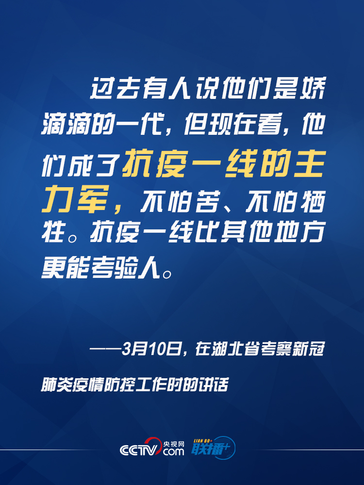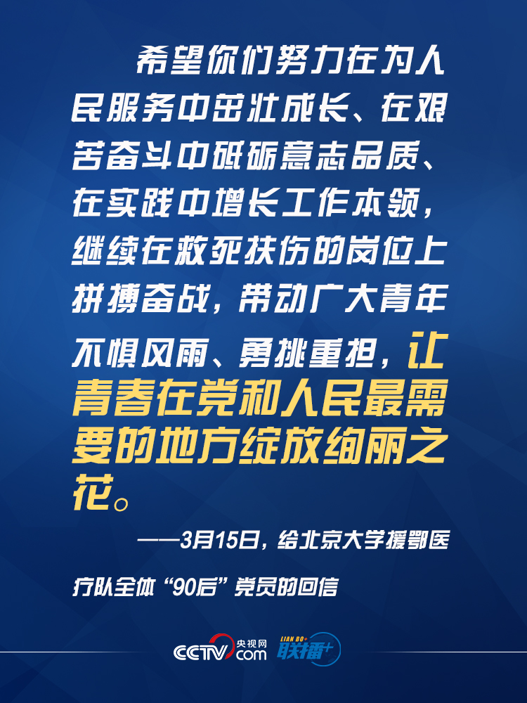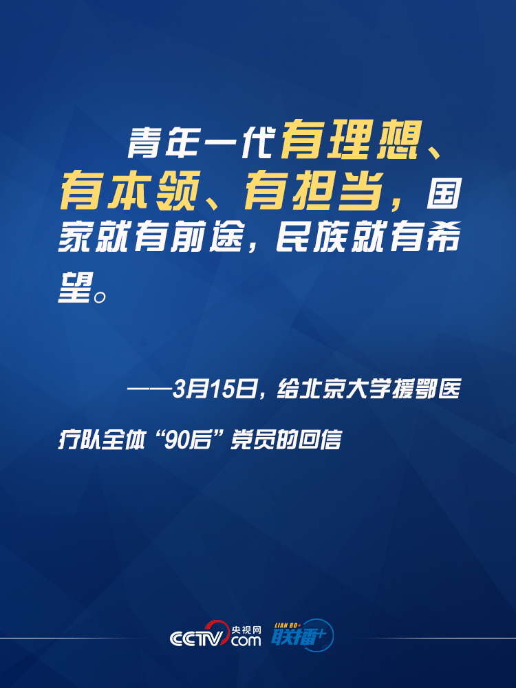 在这次抗击疫情的斗争中,以“90后”为代表的青年一代挺身而出、担当奉献,在4.2万多名驰援湖北的医护人员中,就有1.2万多名是“90后”,其中相当一部分还是“95后”甚至“00后”。央视网《联播+》特梳理总书记对新一代青年的深情赞誉和嘱托,和广大青年一起在党和人民最需要的地方绽放绚丽之花。