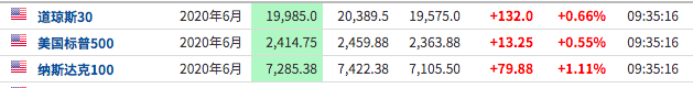 截至当地时间3月18日晚上9时35分,标普500股指期货2020年6月合约报2414.75点,上涨0.55%;纳斯达克股指期货2020年6月合约上涨1.11%,报7285.38点;道琼斯指数期货2020年6月合约报19985点,涨0.66%。