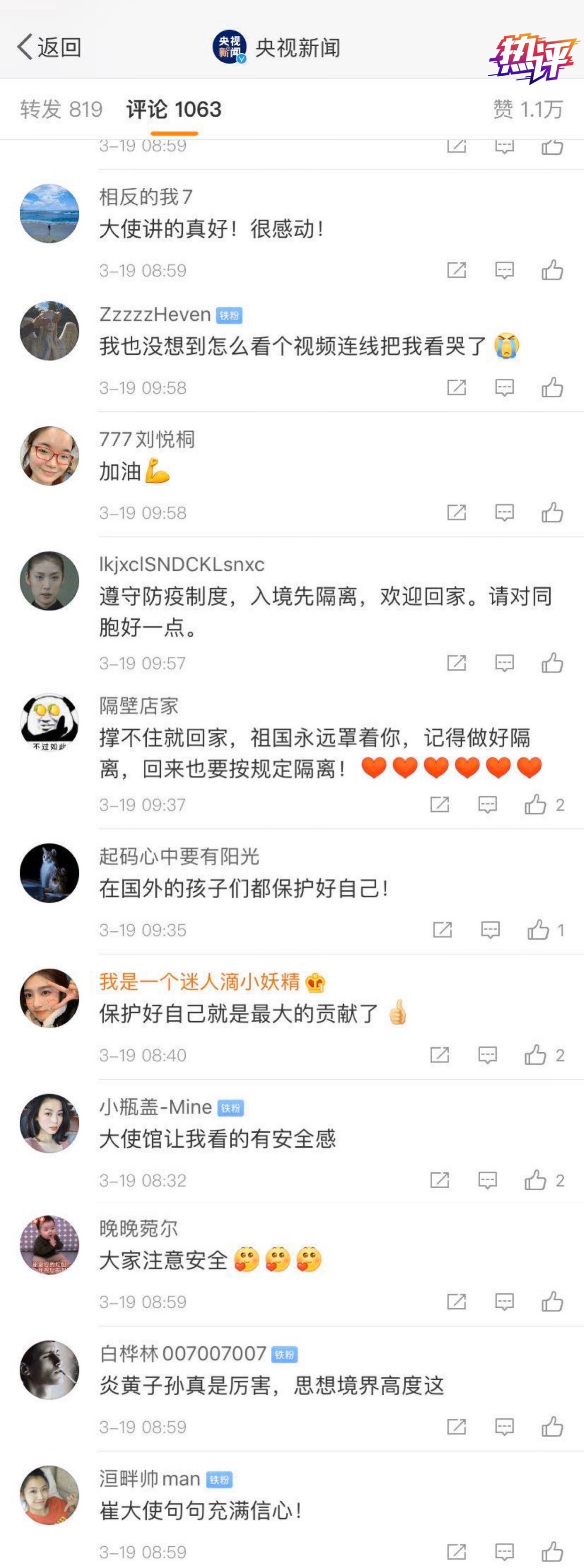崔大使掏心窝子的话让留学生们感动,也感动了网友: