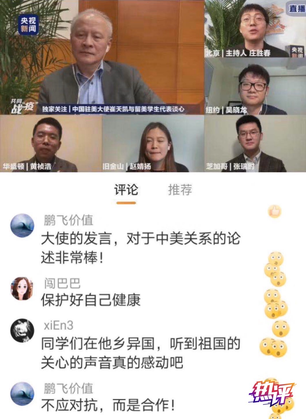 “我们都是家里人,今天我们就算是在线一起坐在客厅里谈谈心,我很想听听同学们的想法。”这是驻美大使崔天凯在央视新闻直播间里与在美留学生代表的对话直播中的开场白。