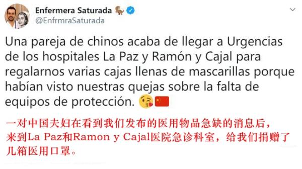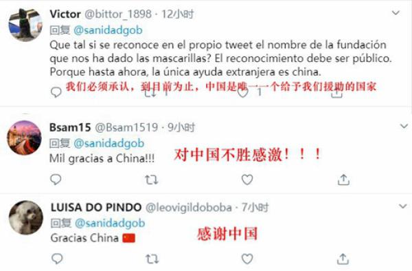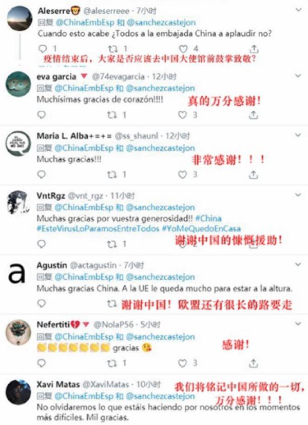 对于中国的无私援助和当地华侨华人的积极捐赠,西班牙当地民众也表达了他们的看法,称如今唯一给予西班牙援助的不是欧盟和美国,而是中国。