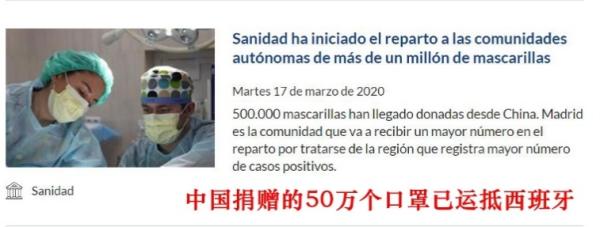 西班牙政府官网发文表示,目前已收到中国捐赠的50万个口罩,并开始着手向新冠肺炎疫情的重灾区进行分配。