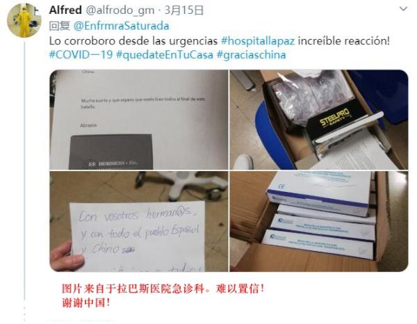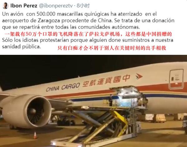 随后,西班牙卫生及社会政策部也在推特上证实,一架载有50万个外科口罩的货机从中国抵达西班牙萨拉戈萨机场。西班牙电视五台的记者佩雷斯(Ibon Perez)表示,当国家公共卫生安全遭到冲击时,只有白痴才会不屑于接受别人的援助,中国捐赠的50万个口罩,对西班牙来说就是一场“及时雨”。