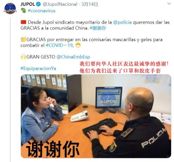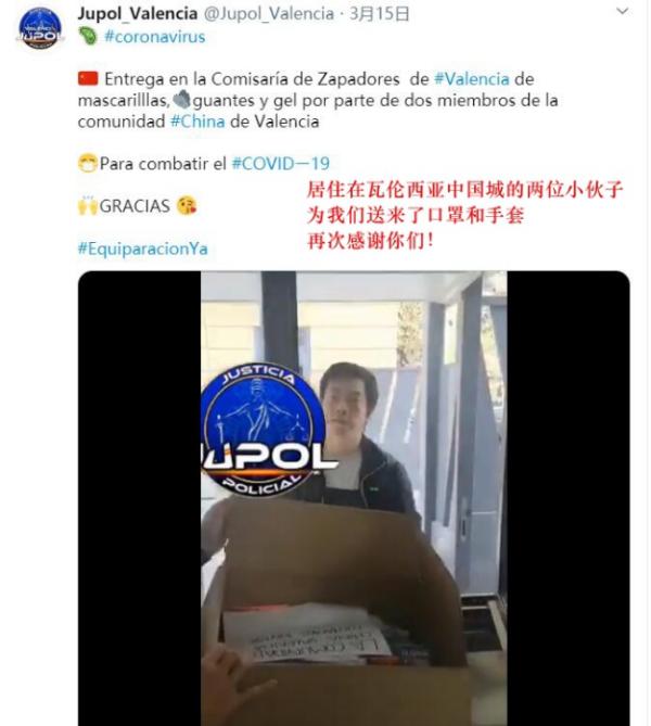 不仅如此,在赫塔菲(Getafe)和瓦伦西亚(Valecia)警察局门外,正在执勤的警察也收到了当地社区华人送来的口罩、胶皮手套和消毒液,警察局在官方推特上向这些善良的华人群体表达了感谢。