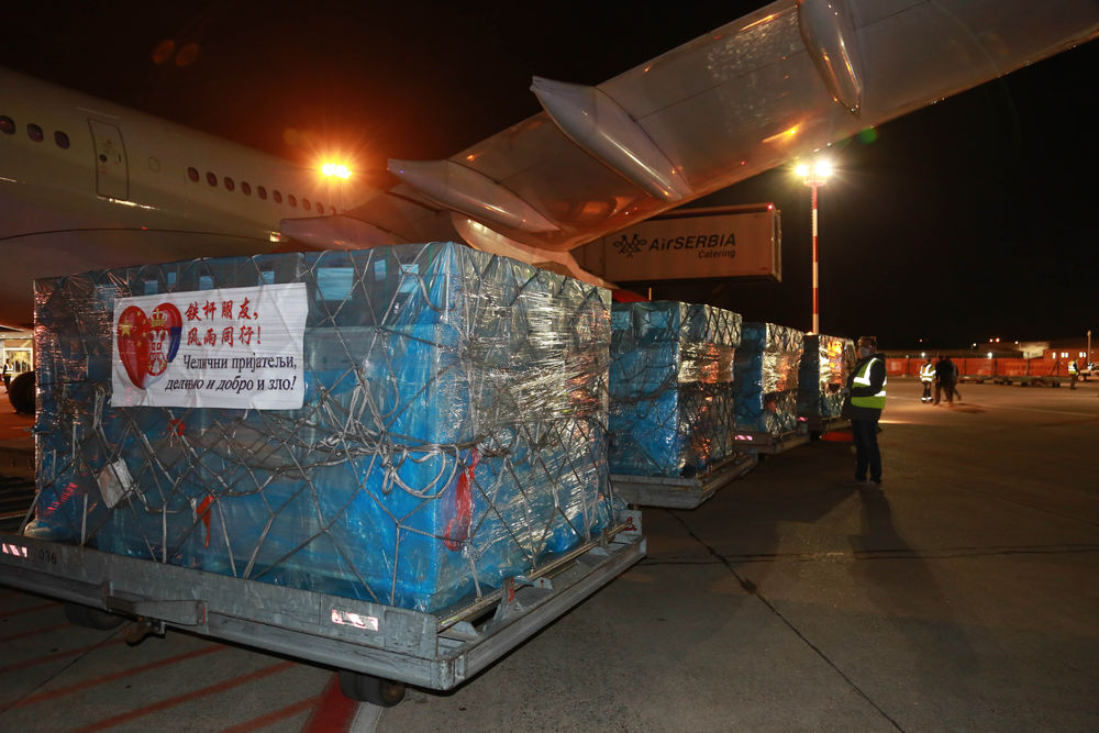 3月21日,在塞尔维亚首都贝尔格莱德,写有“铁杆朋友,风雨同行”字样的中方捐赠医疗物资从飞机上卸下。新华社记者石中玉摄