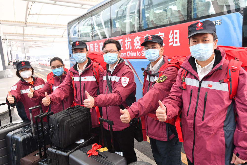 3月21日,中国赴塞尔维亚抗疫医疗专家组在广州白云机场等待出发。新华社记者卢烨摄