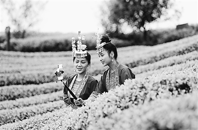 在广西柳州市三江侗族自治县八江镇布央村,侗族姑娘通过直播平台向网民推介三江茶,畅通茶叶销售渠道,帮助茶农增收脱贫。吴练勋摄/光明图片