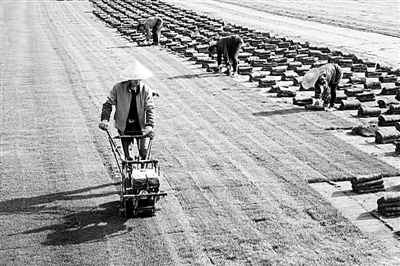 浙江省湖州市南浔区旧馆镇罗汉村塘湾生态农业基地在做好疫情防控的同时,紧扣城市绿化市场需求,积极推进乡村振兴战略,种植草皮面积近200亩,带动村民家门口就业增收。沈勇强摄/光明图片