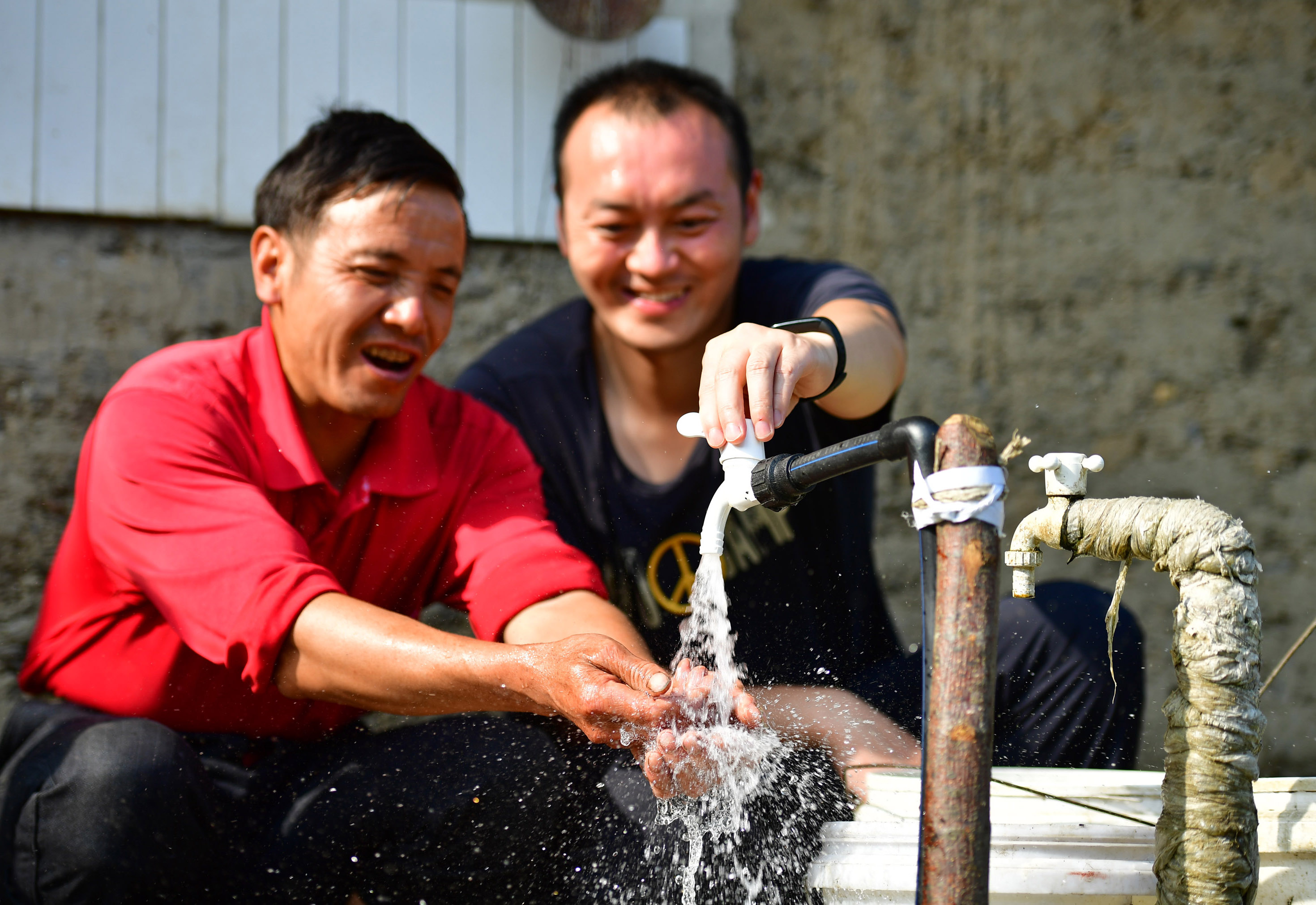 陕西省安康市汉滨区中原镇麻庙村第一书记宋双双(右)与村民熊宗兵打开接通到户的自来水(2019年6月25日摄)。新华社记者 邵瑞 摄