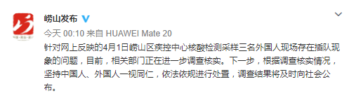 据青岛市崂山区人民政府新闻办公室官方微博消息,4月1日,有网友称青岛某社区市民排队核酸检测时出现外国人插队情况。针对网上反映的该问题,4月2日凌晨,青岛市崂山区人民政府新闻办公室官方微博发布通报称,正在进一步调查核实,调查结果将及时向社会公布。
