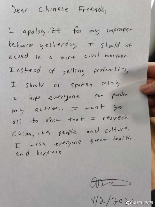 4月2日上午,崂山区公安机关发通报称已会同相关部门,对涉事外籍当事人依法依规进行批评教育,警示其要严格遵守中国法律,自觉遵守社会公共秩序,执行疫情防控有关规定。当事人对此表示诚恳接受,并就其不当言行向公众致歉。