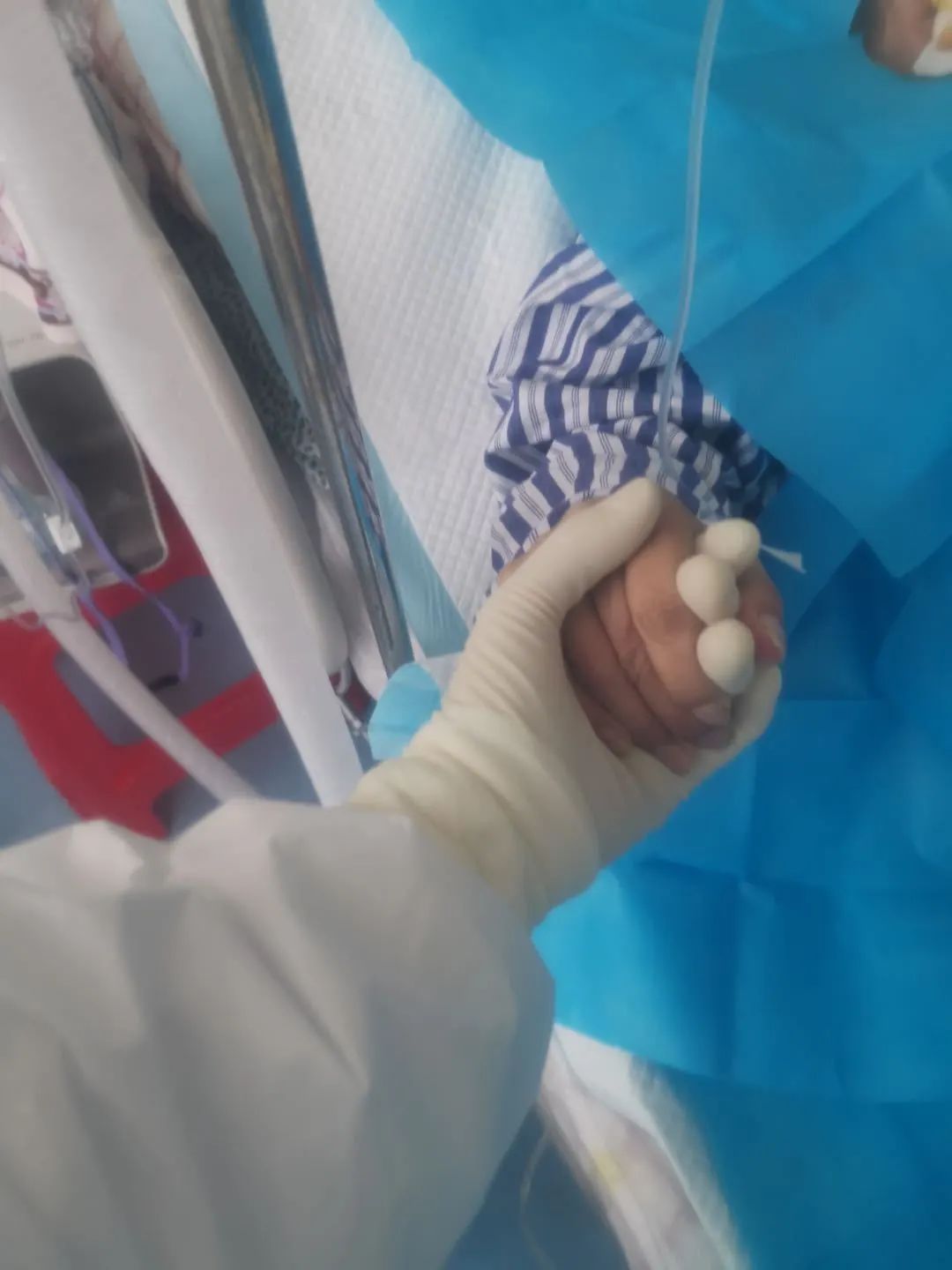 手术前,李阿姨心理负担较重,常常以泪洗面。为了能够给她增加信心,减小压力,手术前,我们反复和她沟通,给她信心,尽可能减少她的心理压力。但因为ECMO手术必须在她清醒状态下先完成才能进行第二项手术,李阿姨显得十分紧张、恐惧,双手不停颤抖的在空中乱舞!看到那一幕,我有些心酸,于是,我冲上前一把握紧了她的手,连忙说:“不用怕,不用怕,阿姨不用紧张!没事的,相信我们,你握紧我的手,不用怕啊!”李阿姨把我的手抓得紧紧的,甚至有点生痛,但我明显的感觉到她紧张的心慢慢地平静了下来,当ECMO成功转机后,镇静药物缓慢的推入到李阿姨的体内后,李阿姨才慢慢的放松了紧握我的手!