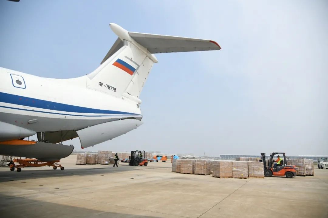 4月4日,多架俄罗斯空军的军机相继降落上海浦东国际机场。随后,包机装载包括口罩在内的从中国采购的防疫物资,于4日、5日相继返回俄罗斯。