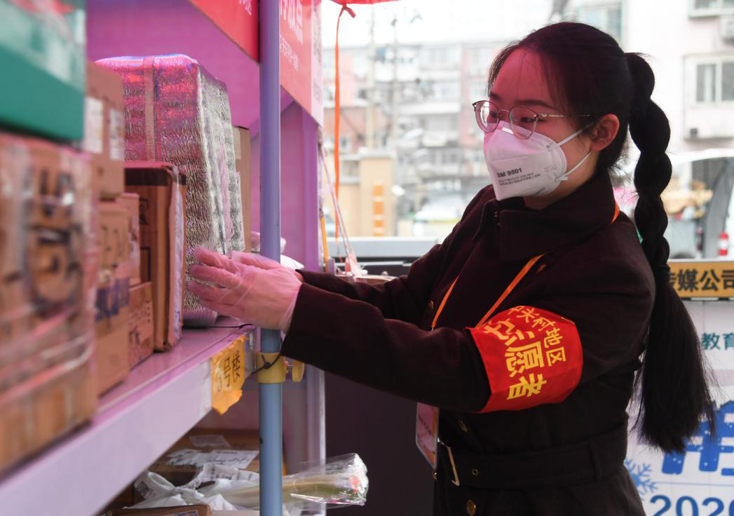 王玥是北京市中关村街道白塔庵社区的“90后”志愿者。新冠肺炎疫情发生以来,她每天同社区的党员干部、社区志愿者们一起值班参与疫情防控志愿服务。图为王玥在白塔庵社区内整理快递架上的快递。新华社记者 任超/摄