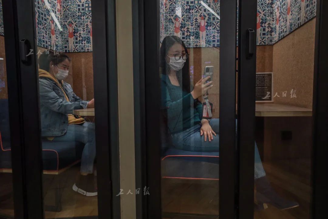 ↑4月1日,WeWork联合办公空间内,会员正在电话亭中分散办公。