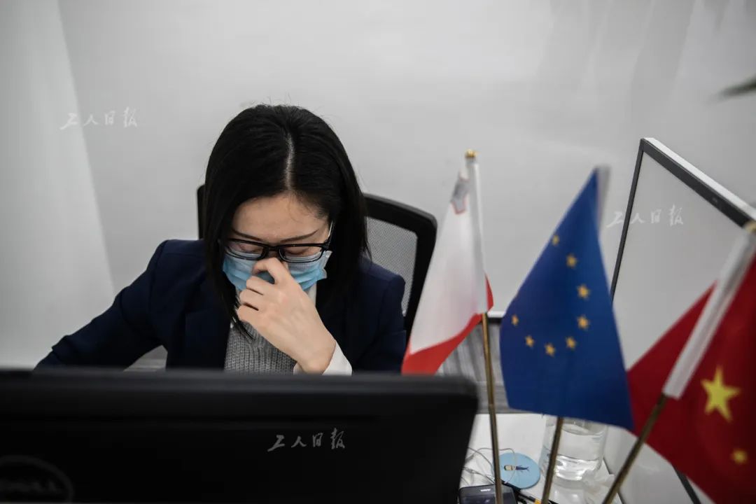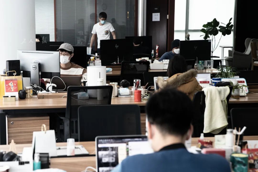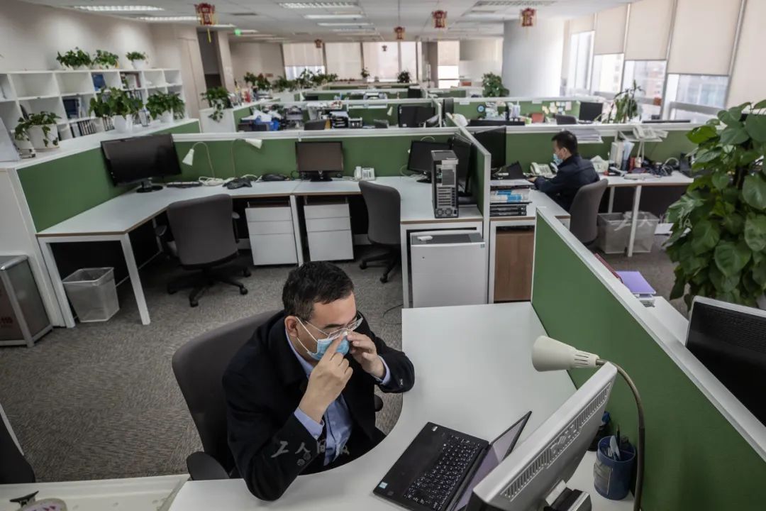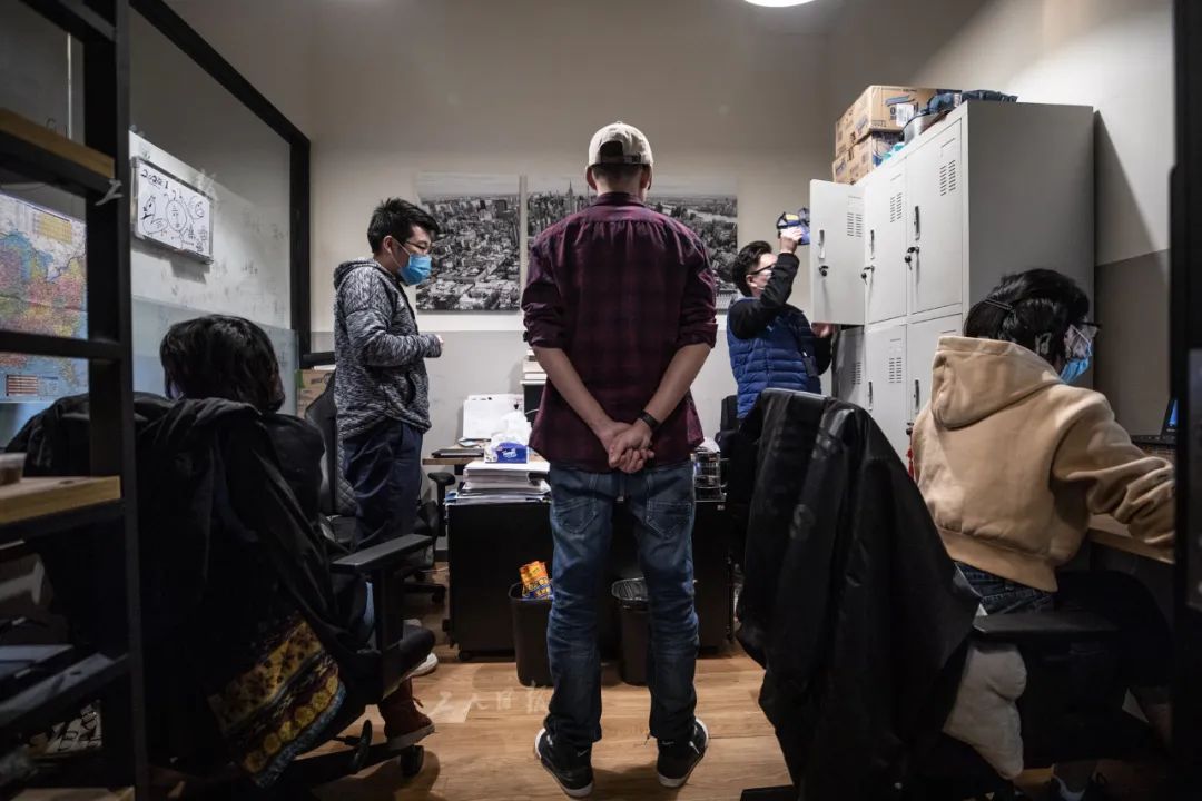 ↑4月1日晚,叶扬一个人在办公室里,结束工作后,他揉了揉眼睛。疫情期间,该公司鼓励员工错岗上班、在线办公。
