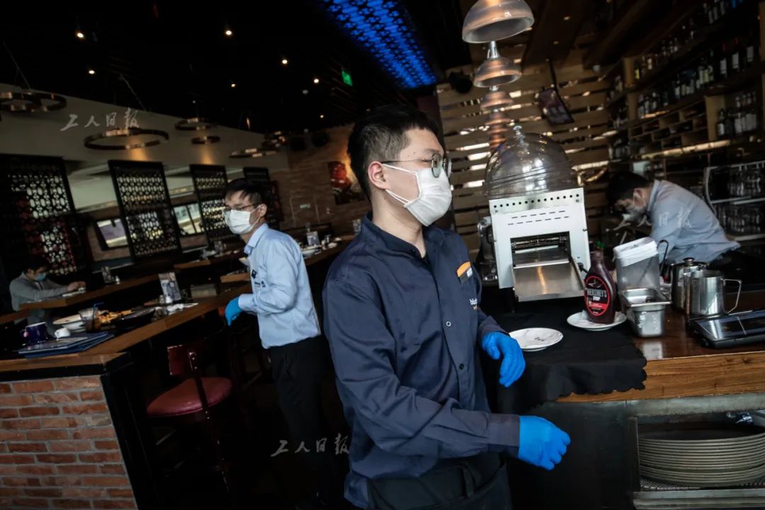 ↑3月30日中午,一家西餐厅内,值班经理李朋正为入店就餐的客人测量体温。疫情期间,该餐厅推出多种套餐和线上外卖,以减少疫情带来的经济损失。