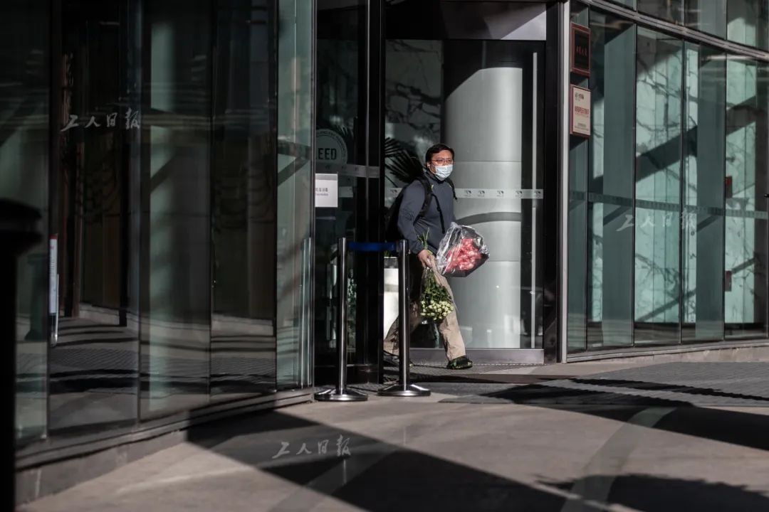 ↑3月28日下午4时左右,不少企业的员工已经开始陆续下班,一名男士拿着两束鲜花走出大楼。
