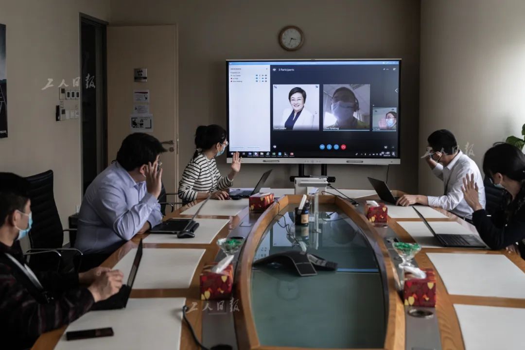 ↑ 4月1日,沃尔沃(中国)投资有限公司内,值班的员工正和居家办公的同事进行视频会议。